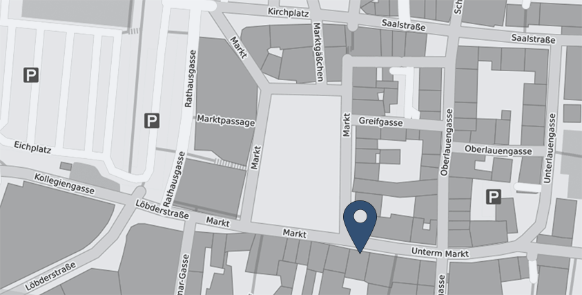 Meine Praxisräume liegen im Stadtzentrum von Jena, direkt am Markt und sind mit öffentlichen Verkehrsmitteln wie Bus und Straßenbahn (Haltestellen Löbdergraben oder Holzmarkt) sowie mit Rad oder zu Fuß gut erreichbar. Leider sind aufgrund der Marktlage keine Stellplätze für Auto oder Fahrrad direkt an der Praxis verfügbar - aber in direkter Nähe finden sich mehrere öffentliche Parkgelegenheiten (u.a. Eichplatz, Tiefgarage Neue Mitte), von denen aus Sie die Praxis problemlos erreichen können.